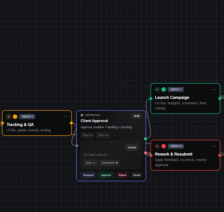 Nodes, tasks, flow, approvals, deliverables, and chat - all attached to the work.